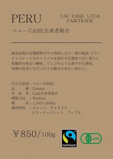 【産地・特徴】 生 産 国:ペルー共和国 品 種:カトゥーラ 生 産 者:Casil生産者組合 精製方法:ウォッシュド 標 高:1,150-1,800m 風味特性:オレンジ、キャラメル、ビターチョコレート、アップル ラ ン ク:フェアトレード、有機JAS認証